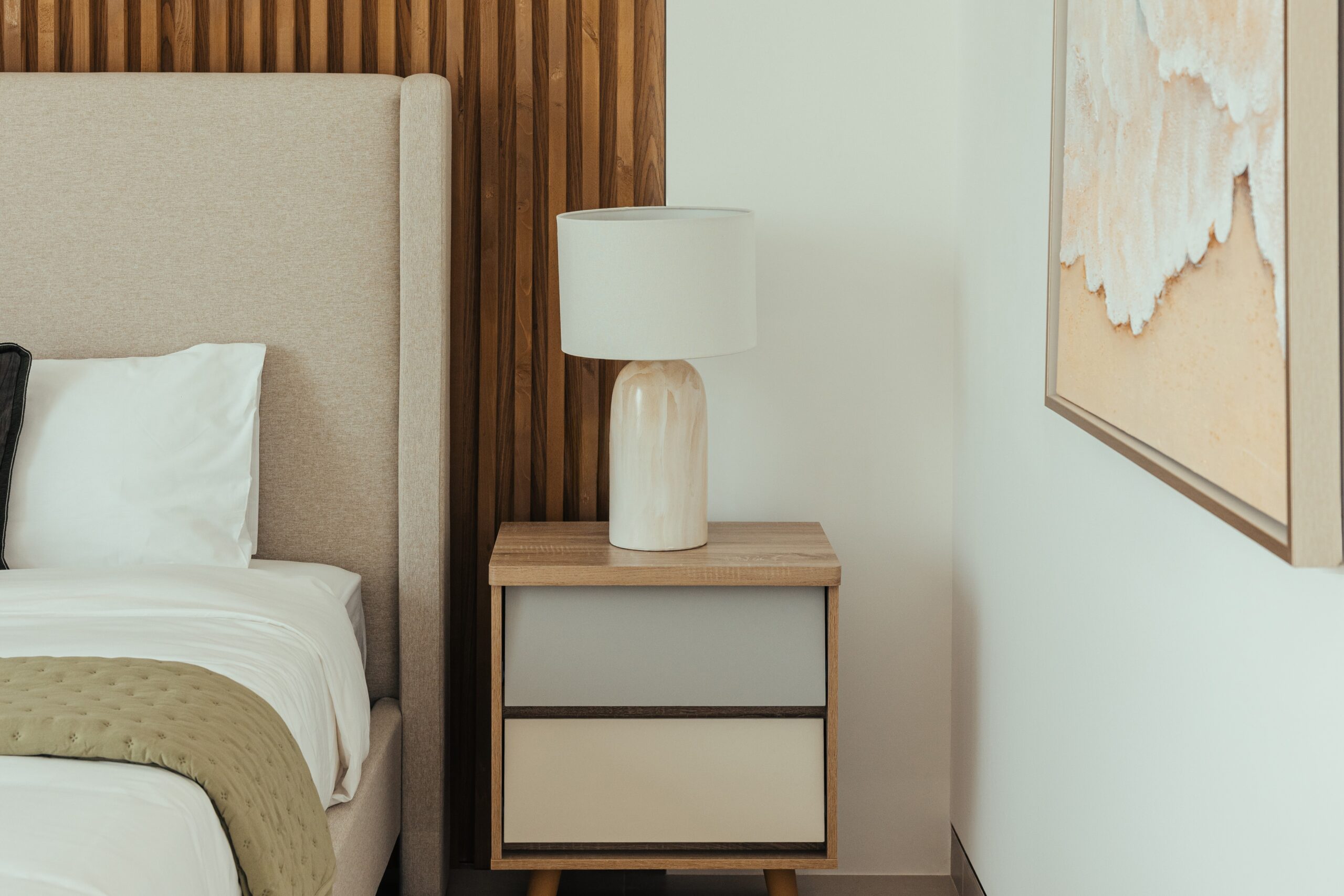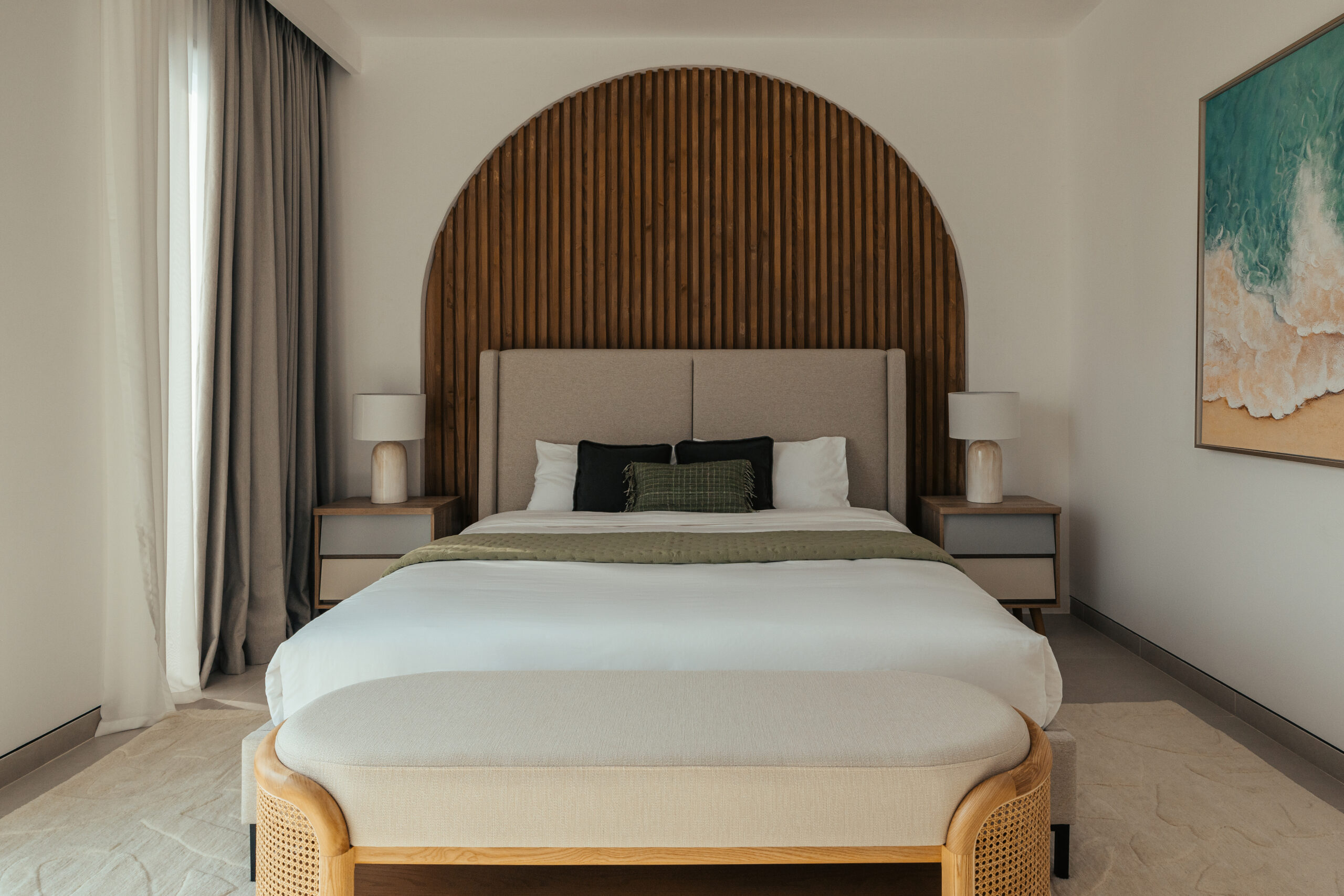 • master suite: an oasis of calm with a tall wooden headboard and minimalist decor;
