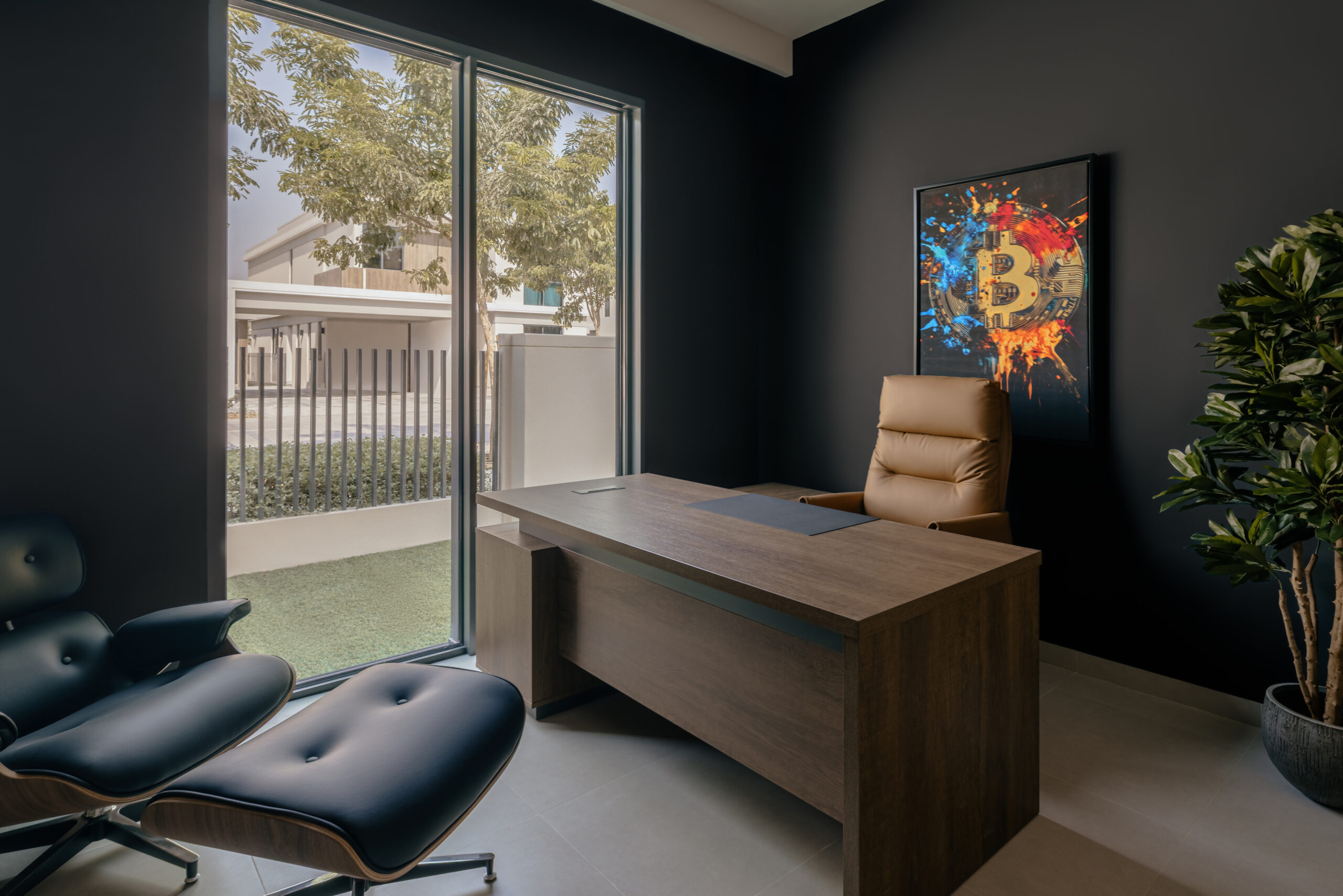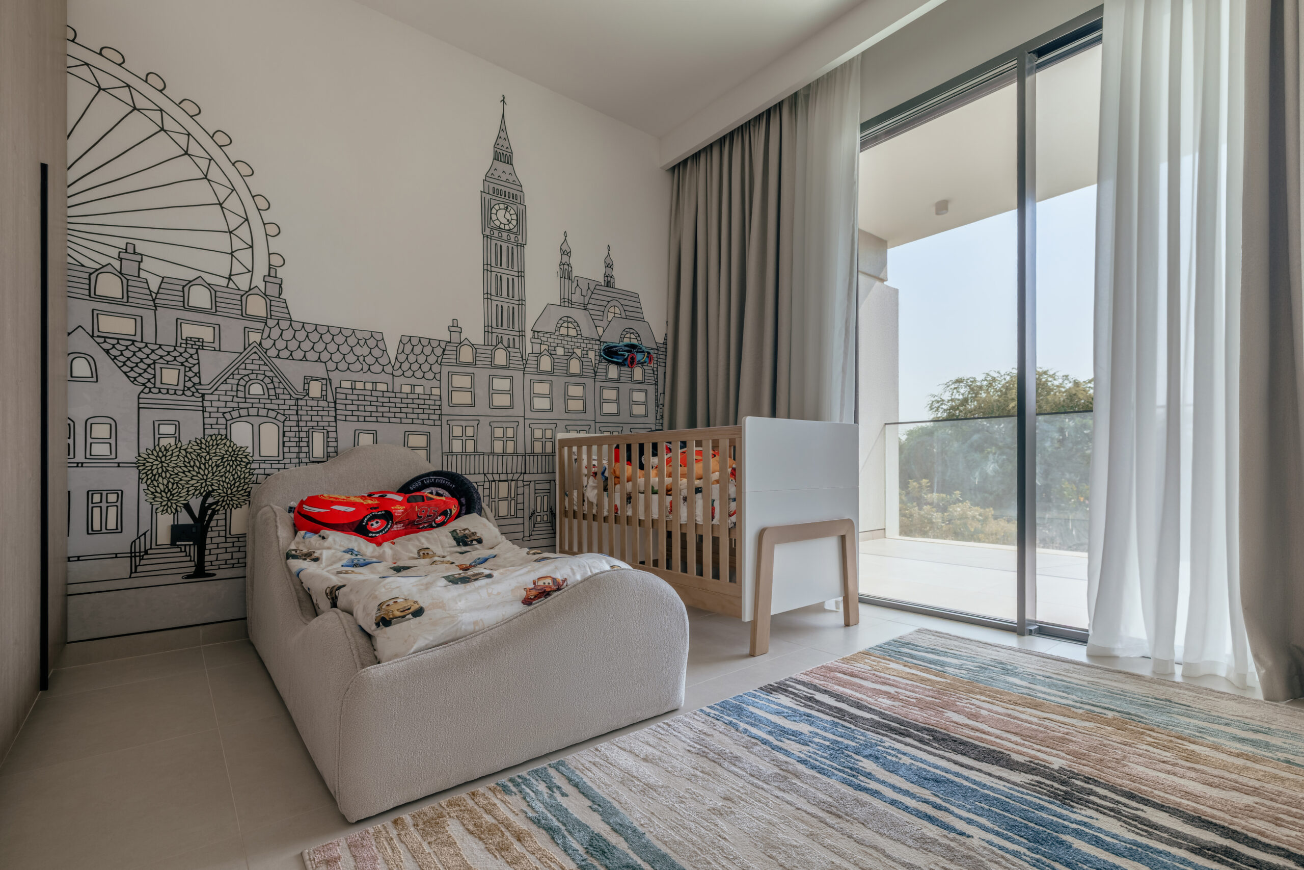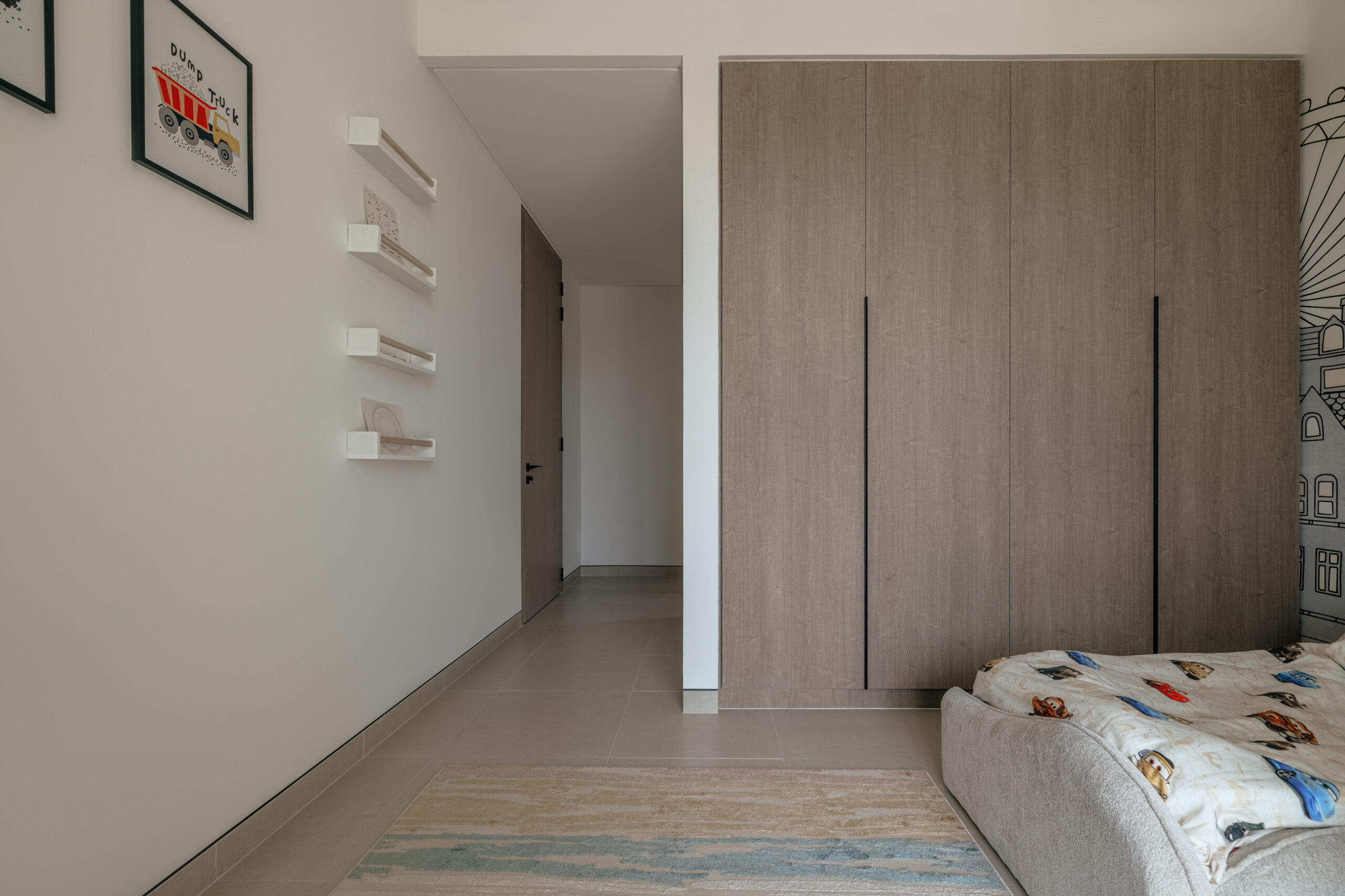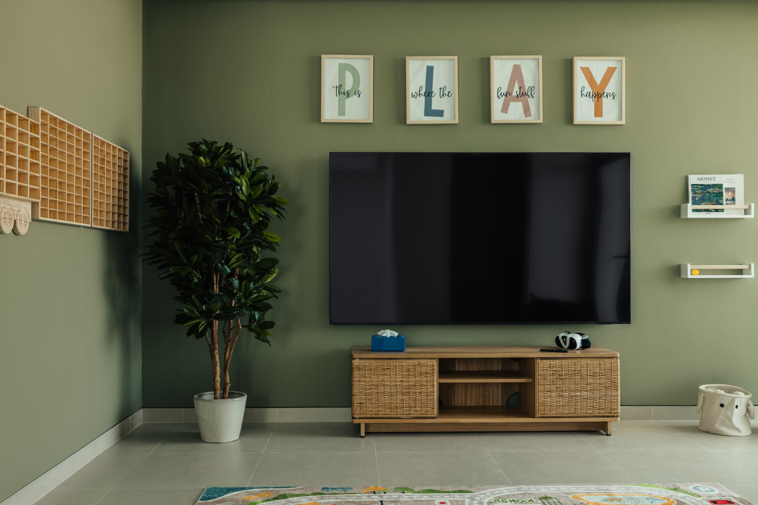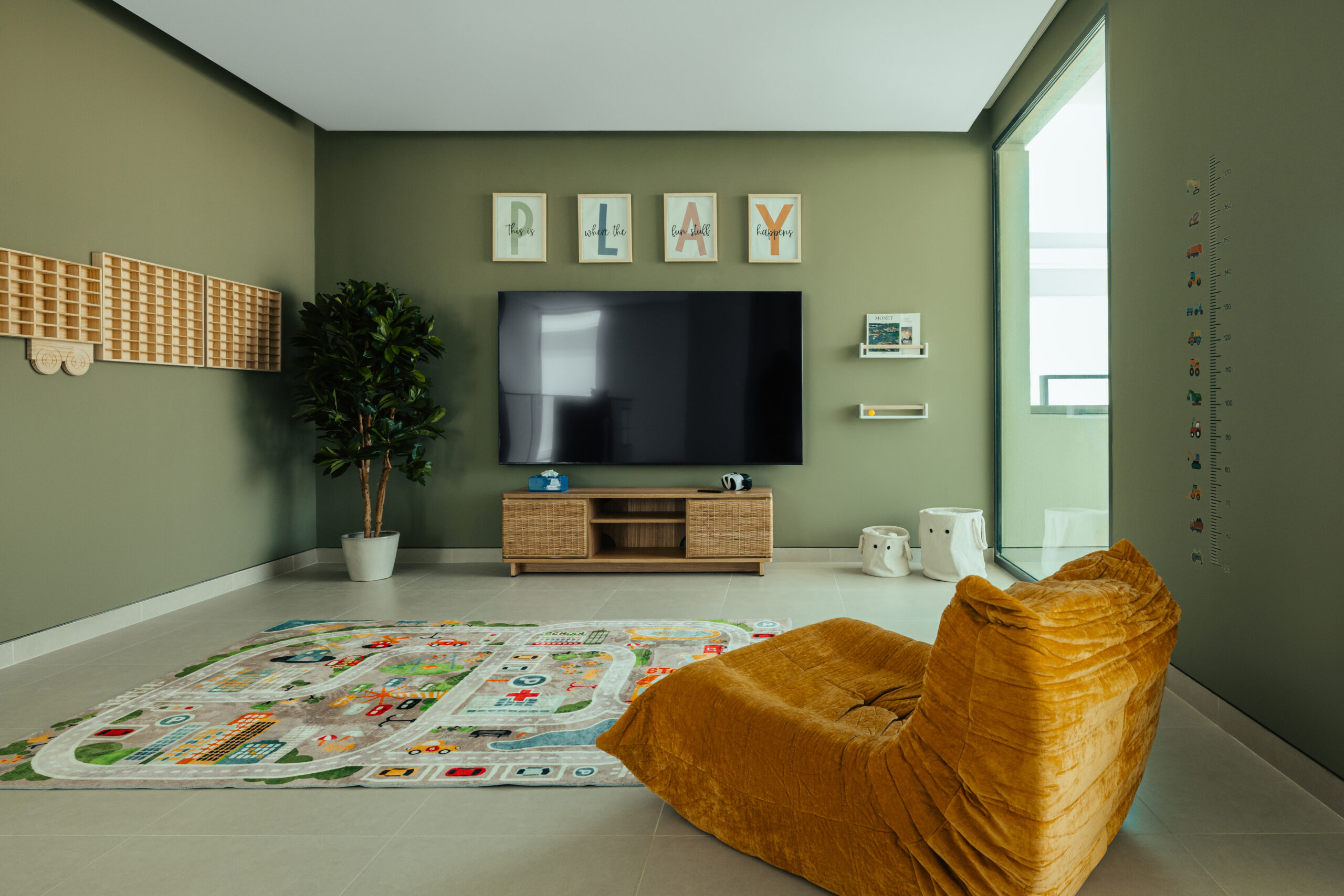 • unique accent rooms: Individual spaces styled in deep, natural tones, including an olive-green play room, kids room with an urban vibe and a moody, dedicated office.