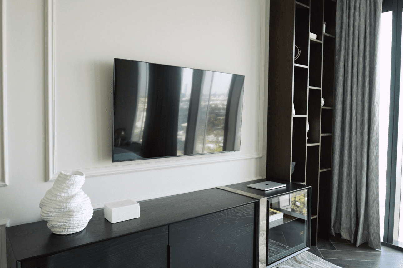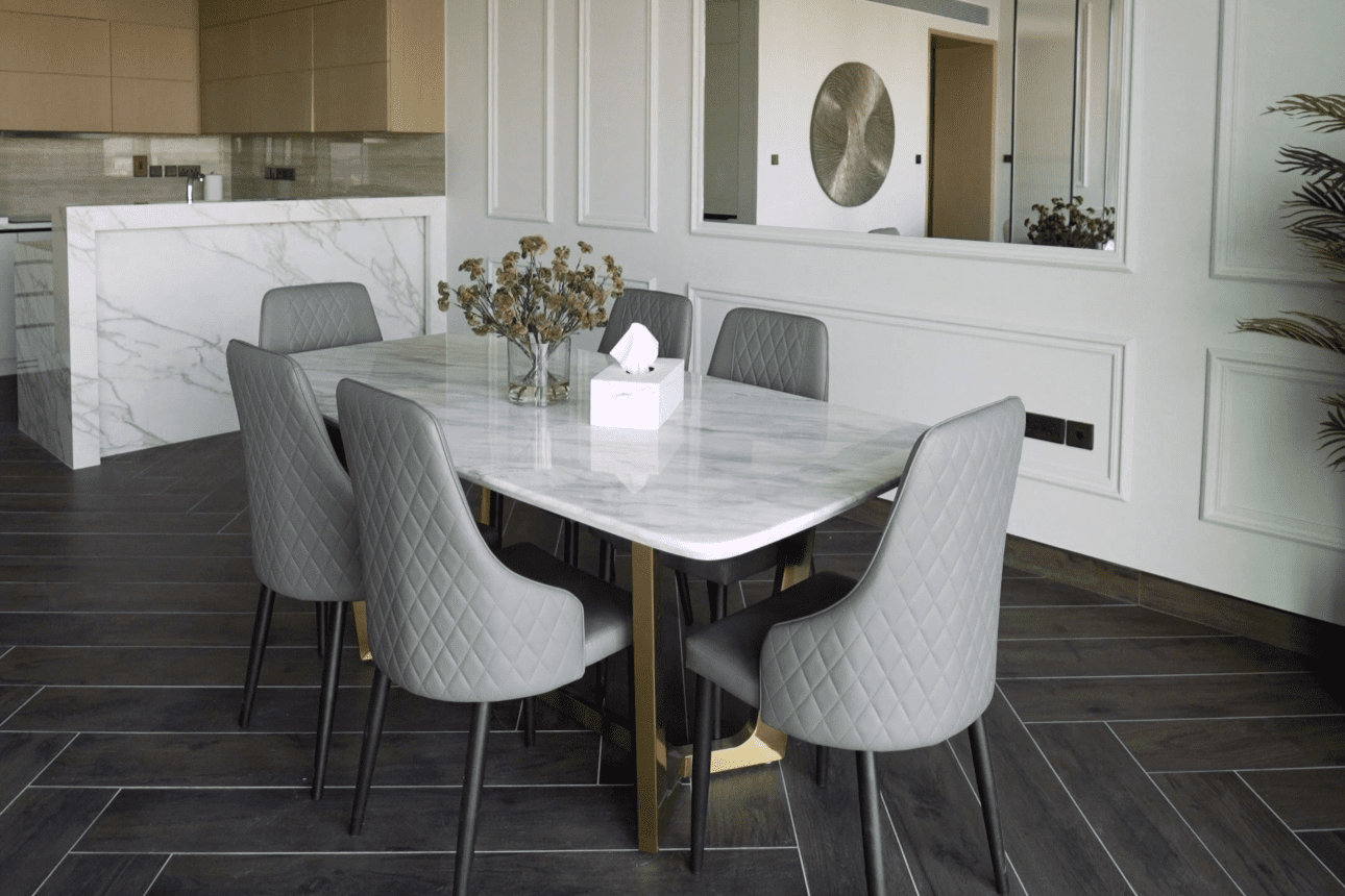 An apartment defined by quiet luxury and sophisticated detailing. This design blends a soft neutral palette with dark, glamorous accents and custom architectural elements for an elevated, refined feel.