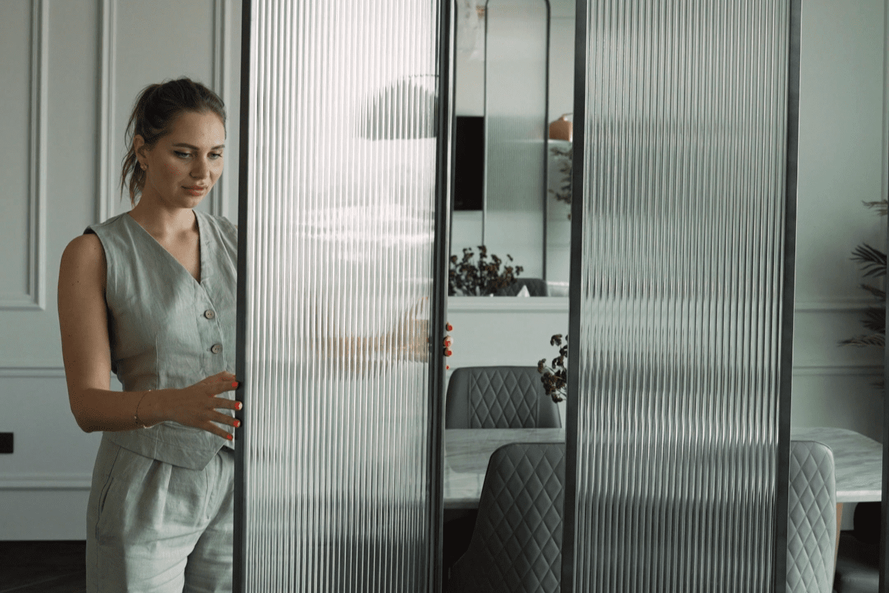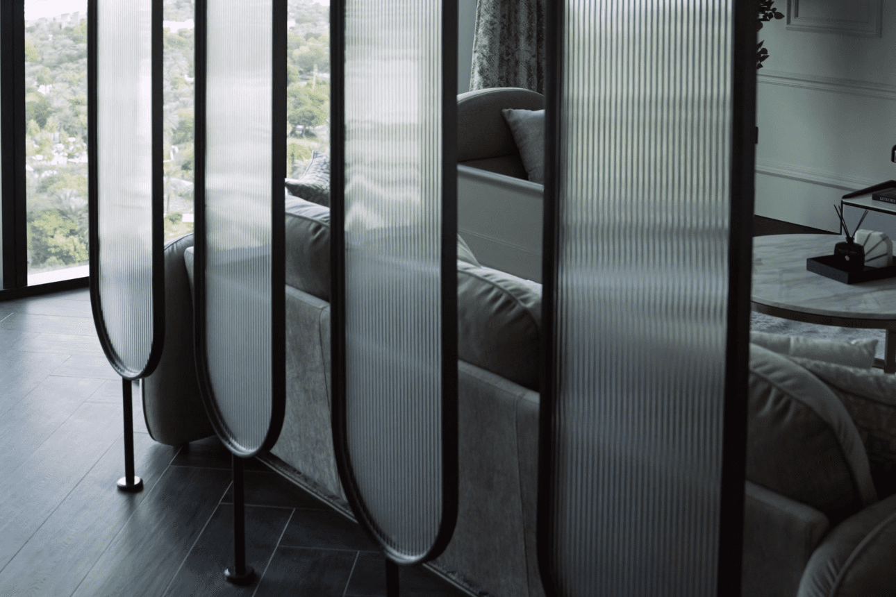• architectural partitions: spaces are subtly defined by striking black-framed internal screens, adding structure and visual interest;